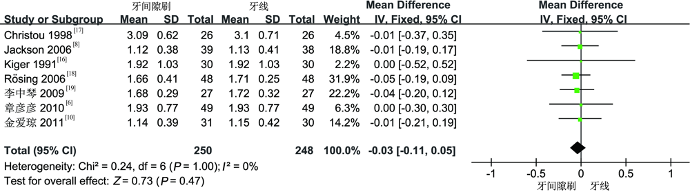 目的 评估常见的机械性邻面菌斑控制措施对牙周炎患者邻面菌斑控制的效果,为临床口腔医生选择对患者合适的邻面菌斑控制措施提供有效的循证医学证据。方法 计算机检索Pubmed、EMbase、Cochrane、Web of Science、CNKI、CBM、万方数据库中发表1980年3月至2020年4月的文章,对符合纳入标准的文献进行系统评价并进行可能的定量分析。结果 最终纳入13项研究。分析提示:与牙线组比较,牙间隙刷组对菌斑指数有显著改善效应(P<0.000 01)。结论 对于牙周炎患者使用邻面菌斑控制措施能去除更多的牙菌斑,作为刷牙的辅助手段,使用牙间隙刷比使用牙线能去除更多的牙菌斑。