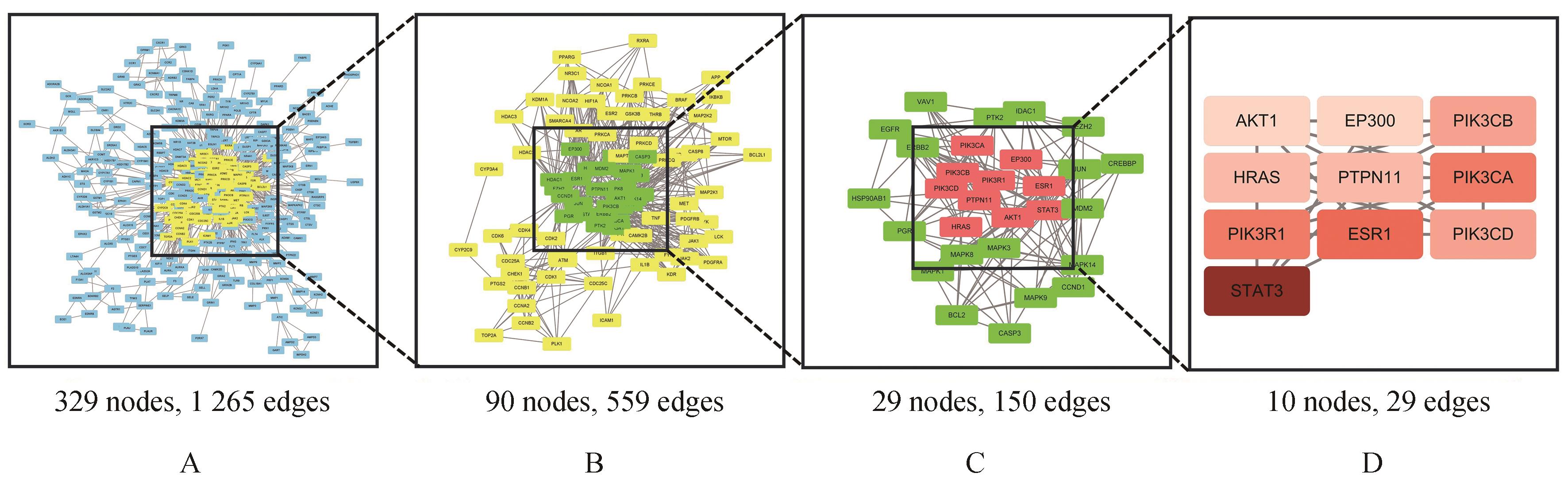 关键靶点筛选网络图A:初步构建PPI网络后,根据度中心性二倍中位数筛选靶点(黄色);B:根据度中心性、中介中心性、接近中心性中位数再次筛选靶点(绿色);C:根据度中心性二倍中位数选出核心靶点(红色),D:最后得到10个核心靶点,颜色根据度中心性增大由浅至深。"