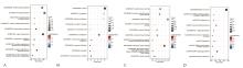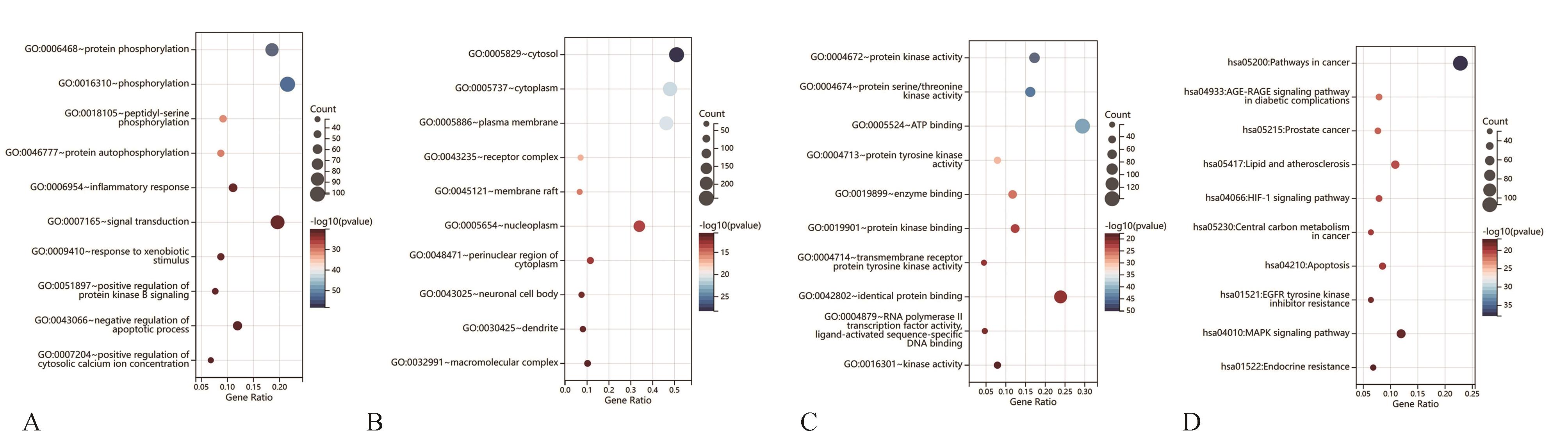 GO及KEGG富集分析气泡图A:GO生物过程分析;B:GO细胞组分分析;C:GO分子功能分析;D:KEGG富集分析;左侧纵坐标对应不同GO/KEGG注释,右侧纵坐标-log10(P值)从红色到蓝色表示数值从小到大,横坐标Gene Ratio代表该词条的基因数占所有基因的比例。Count代表富集到此词条的基因数目,数目越多,气泡越大。每个类别仅列出排名前10(按P值由小到大排序)的条目。"