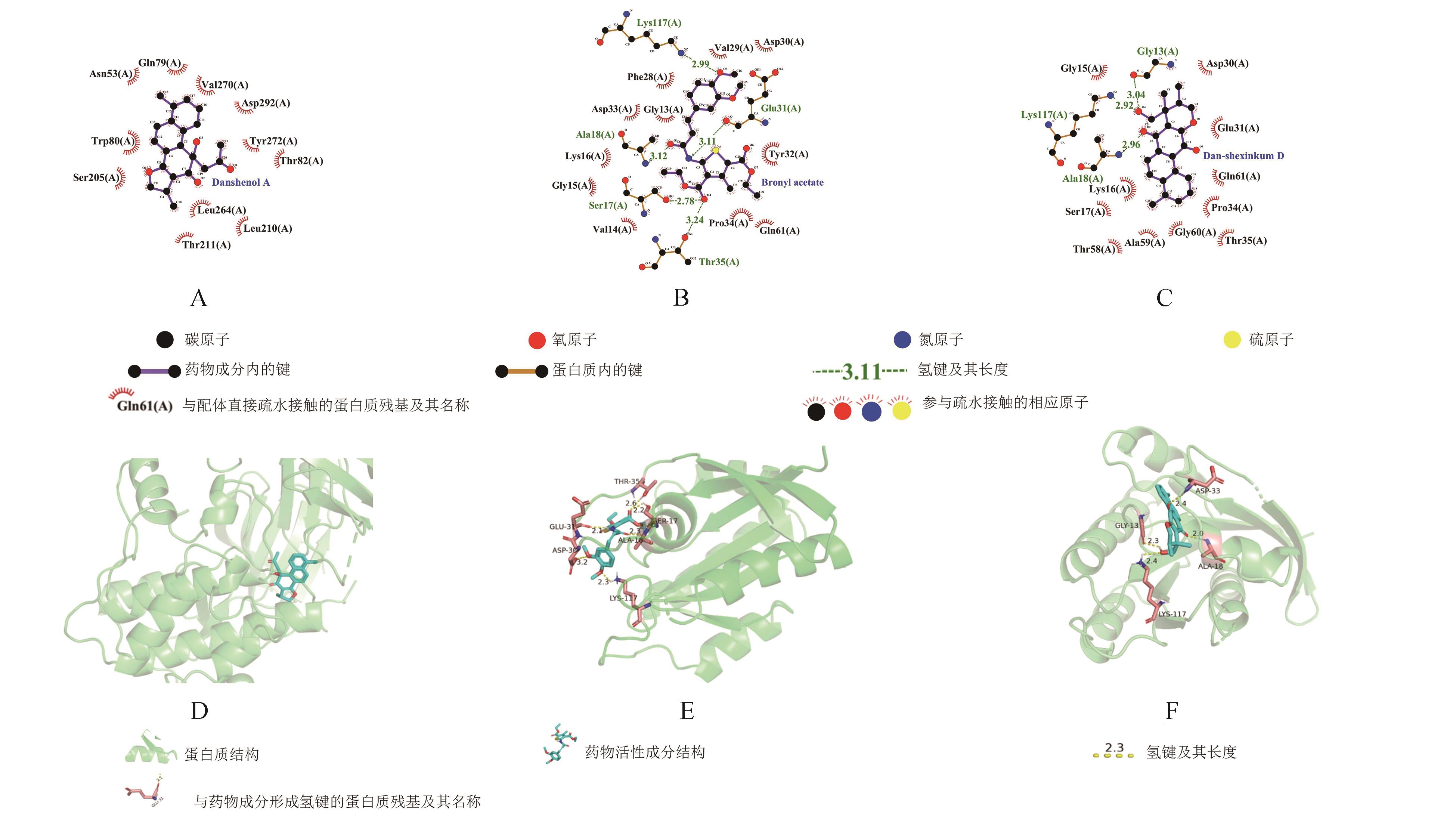 部分关键活性成分与关键靶点的分子对接图A:AKT1-Danshenol A对接2D图;B:HRAS-bronyl acetate对接2D图;C:HRAS-dan-shexinkum D对接2D图;D:AKT1-Danshenol A对接3D图;E:HRAS-bronyl acetate对接3D图;F:HRAS-dan-shexinkum D对接3D图;氢键长度单位为?。"