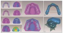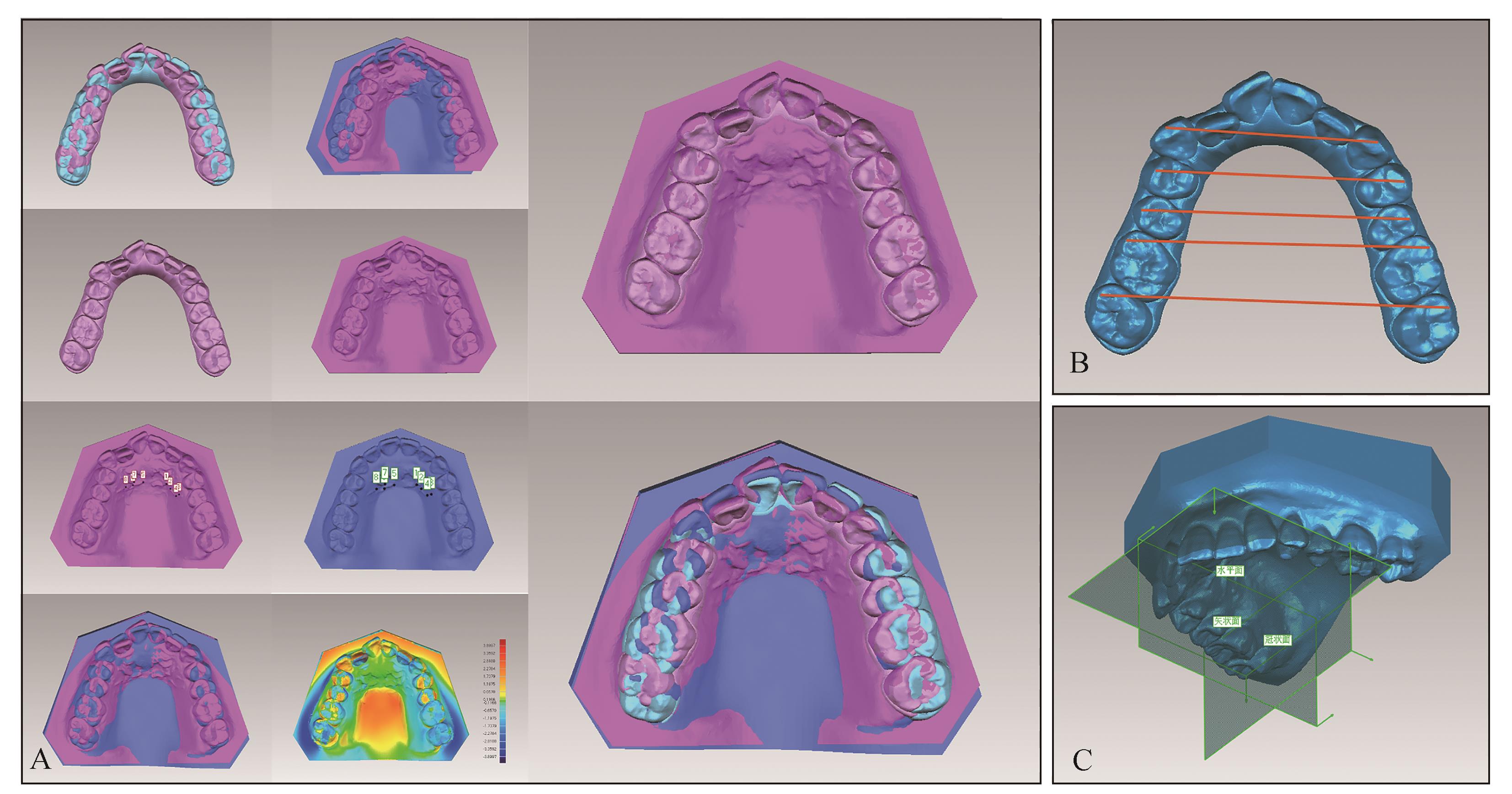 使用Geomagic Wrap 2021进行模型重叠和测量A:模型重叠;B:牙弓宽度测量;C:第一磨牙转矩测量。"