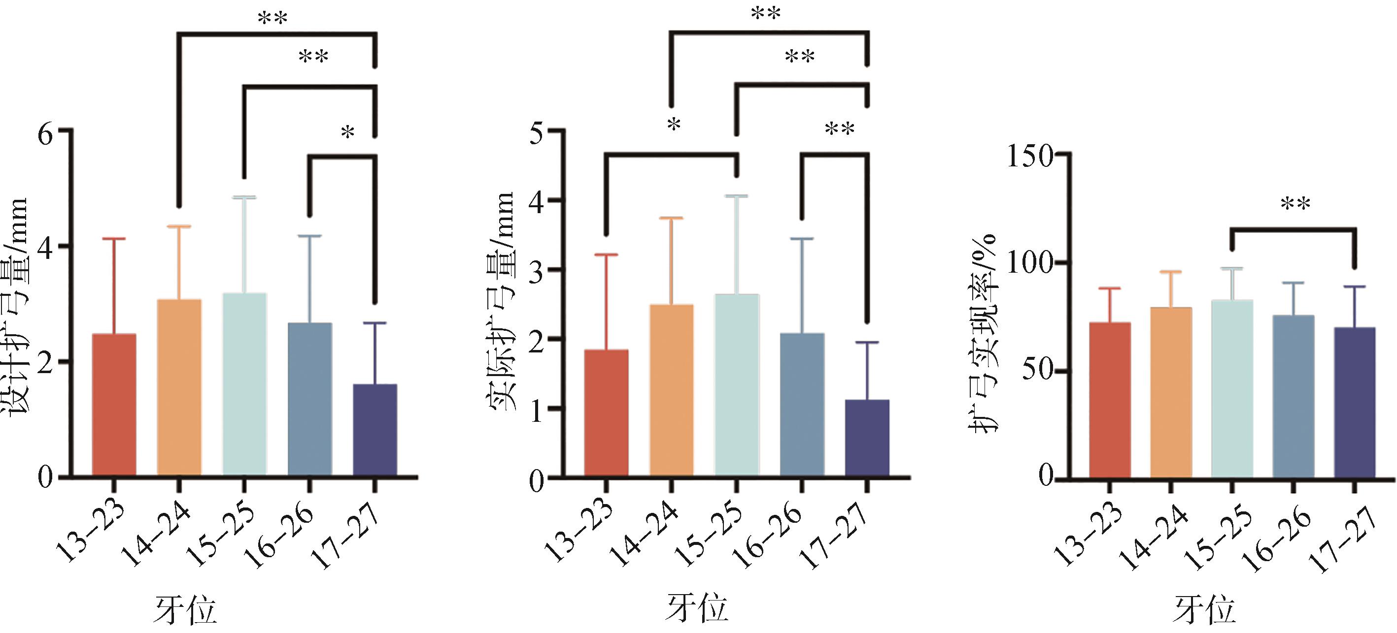 不同牙位扩弓量和扩弓效率的比较*:P<0.05;**:P<0.01。"