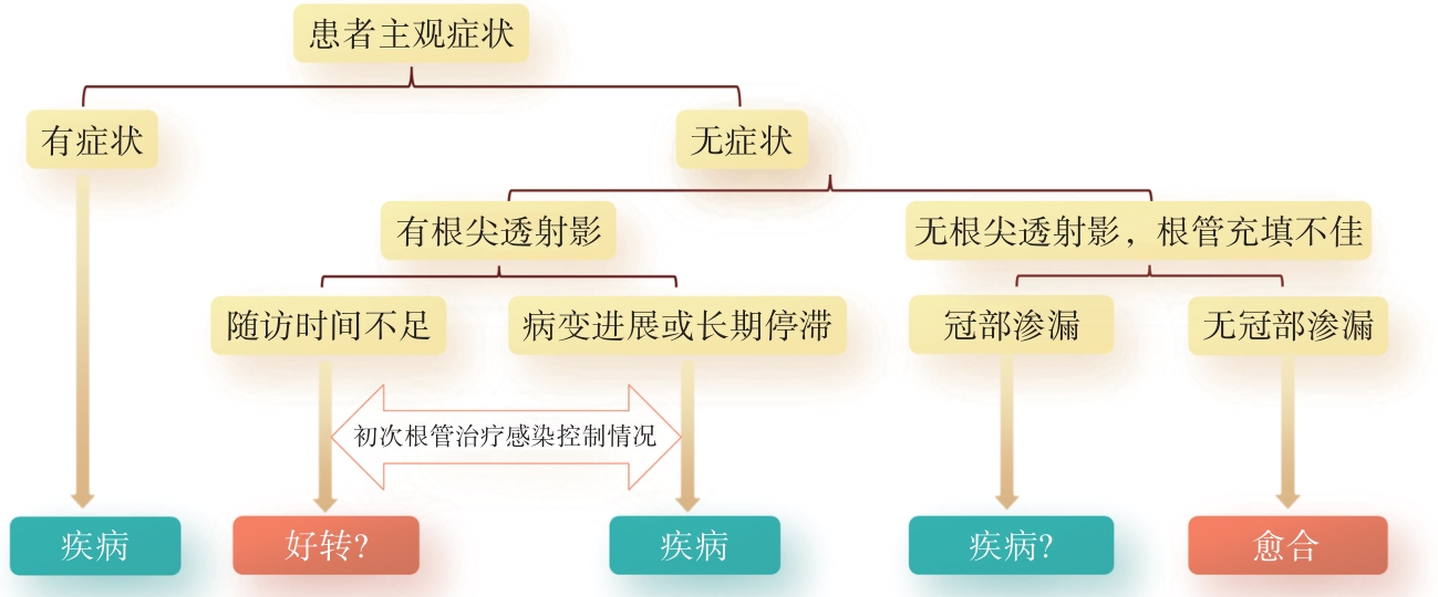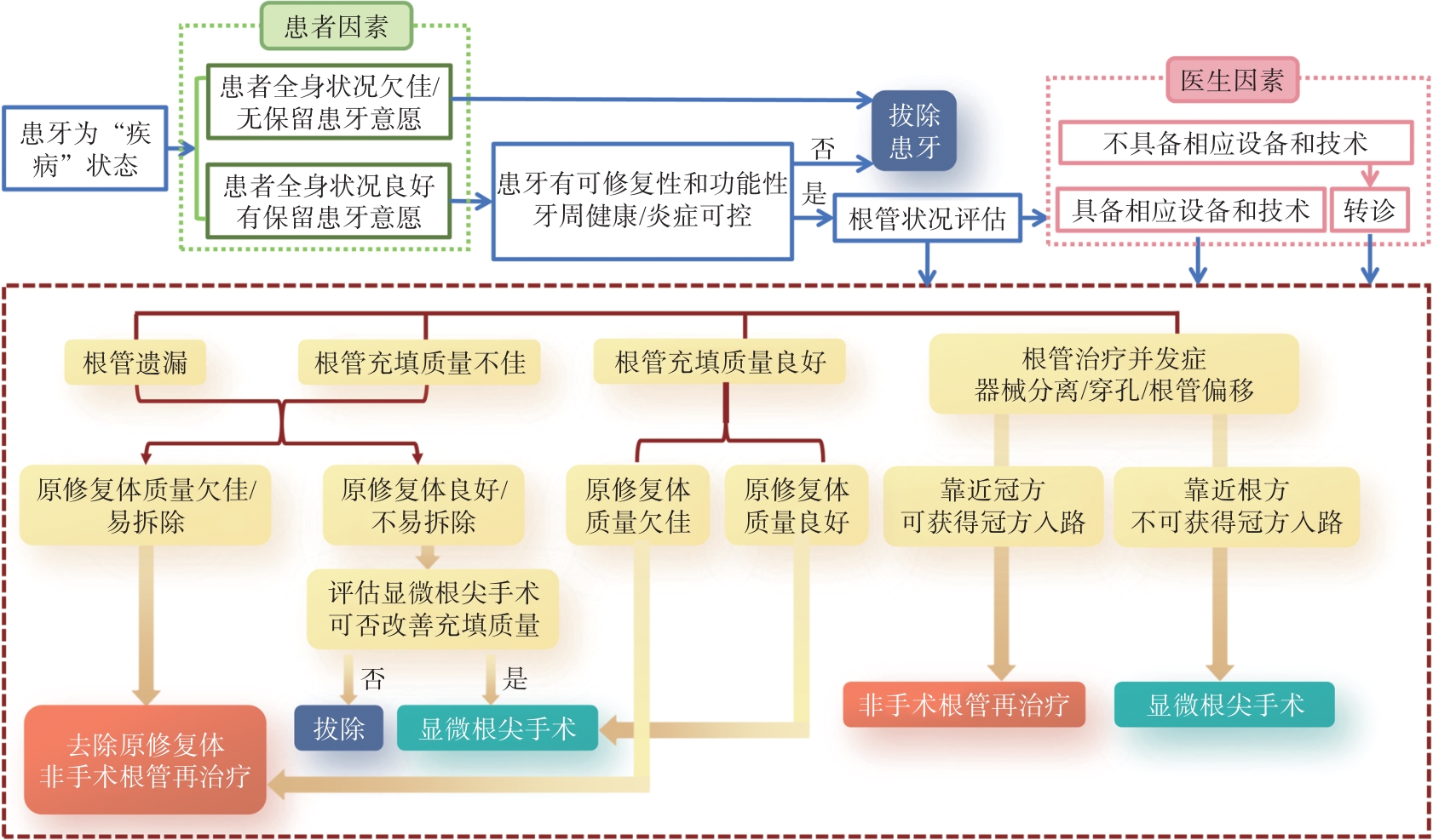根管治疗是牙髓根尖周病的有效治疗手段。由于存在根管系统解剖结构复杂、根管治疗技术敏感性高等因素,因此部分患牙在术后仍会出现根尖周病变迁延不愈、愈后复发或新发病变的情况,常需进行根管再治疗。根管再治疗病例存在冠部修复体、根管充填材料和既往根管治疗并发症等不利因素,其病因判断和治疗难度显著增加。为此,本文系统梳理了以“3D”理念为核心的临床决策流程,即判定是否失败(Decide if fai-lure)、风险‒效益评估(Decide to treat)及治疗方案选择(Decide treatment type)三大关键环节,并基于患牙、患者及医生的三维评估框架,对治疗方案的科学选择进行深入探讨。